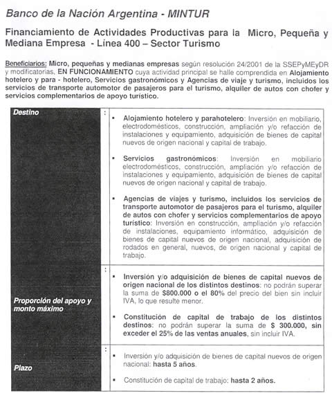 El Banco Nación, además otorga para los tomadores de crédito de la línea 400, de la región Norte Grande, una bonificación de dos puntos extras de la tasa nominal anual de interés, más medio punto al buen pagador, a lo cual se les suman los tres puntos bonificados por el MINTUR con lo cual acceden a una tasa de interés de 9,5 % fija y en pesos.