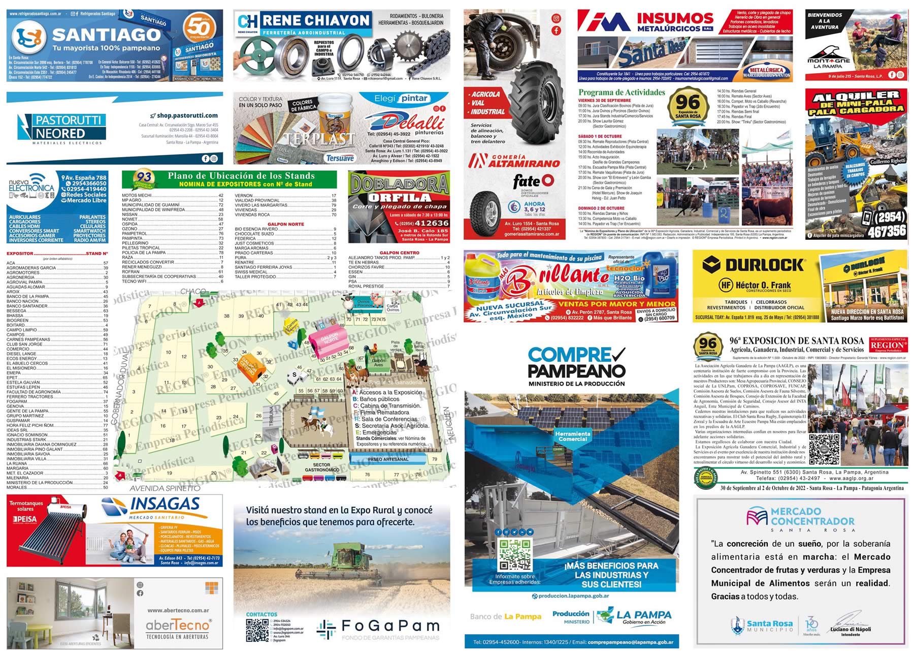 Este material desplegable a todo color es gratuito y debe reclamarse con el pago de la entrada en las boleterías habilitadas. También puede conseguirse en las empresas auspiciantes, en los principales hoteles de la ciudad y en nuestra redacción (uno por persona) en Santa Rosa. La gran fiesta que une al campo y la ciudad ya está nuevamente activa en la capital pampeana. Un fin de semana para disfrutar a pleno en familia y degustar lo mejor de la gastronomía regional.
