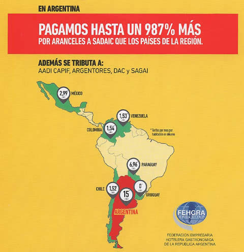 La queja impulsada por FEHGRA en los establecimientos, resume la problemática con la frase: “Nuestra actividad está en riesgo” y completa con un mapa de América Latina donde se indica en dólares las tarifas que se pagan por mes, por habitación, en cada país mencionado: en Uruguay no se tributa por este concepto, la tasa es cero; en Chile es u$s 1,52; en Venezuela u$s 1,53; en Colombia u$s 1,54; en México u$s 2,99 y en Paraguay u$s 6,96. Mientras que en Argentina la cifra crece de manera exhorbitante a u$s 15.