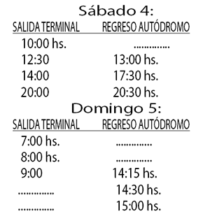 En cuanto al estacionamiento, los vehículos livianos abonarán $ 100, los pesados $ 200 y los livianos en boxes $ 300. Para quienes quieran ir sin auto, la empresa “Rapibus” saldrá de la Terminal de Omnibus de Santa Rosa sábado y domingo hacia el Autódromo.